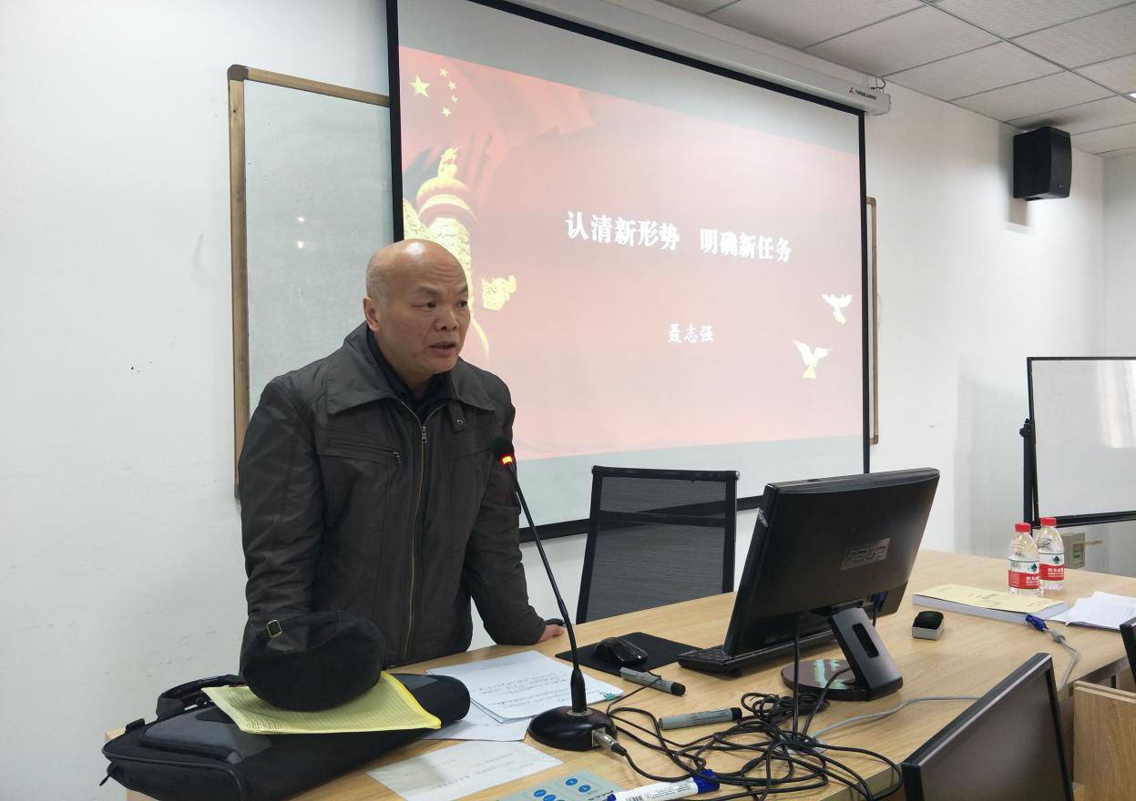 12月22日,学校党委常委、副书记、纪委书记聂志强,在宏文楼5-5教室为国际商学院全体师生党员做题为《认清新形势 明确新任务》的十九大精神宣讲。