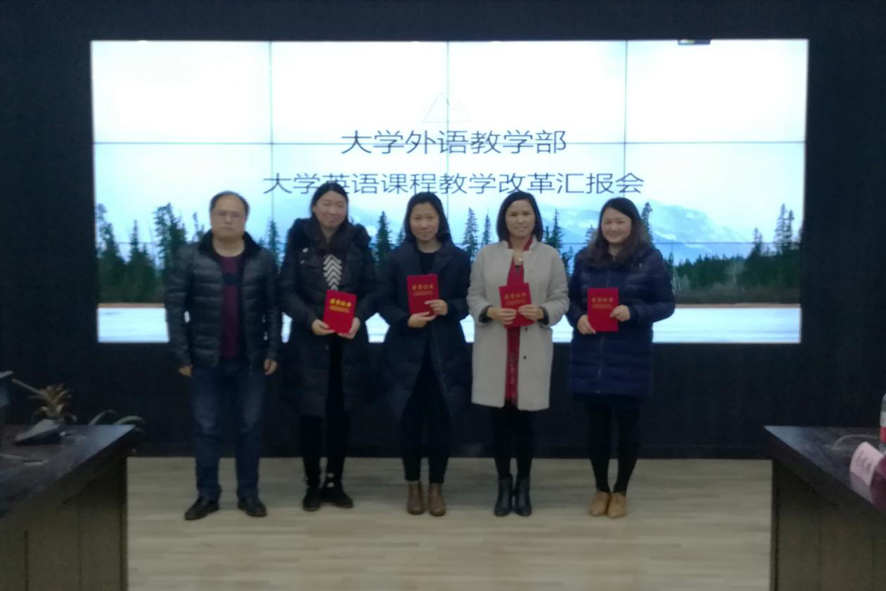 与会领导为《综合英语》项目成果大赛中获奖的师生进颁奖并合影留念。
