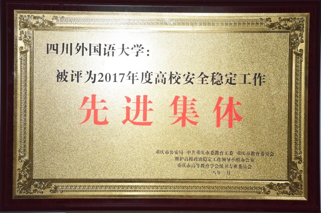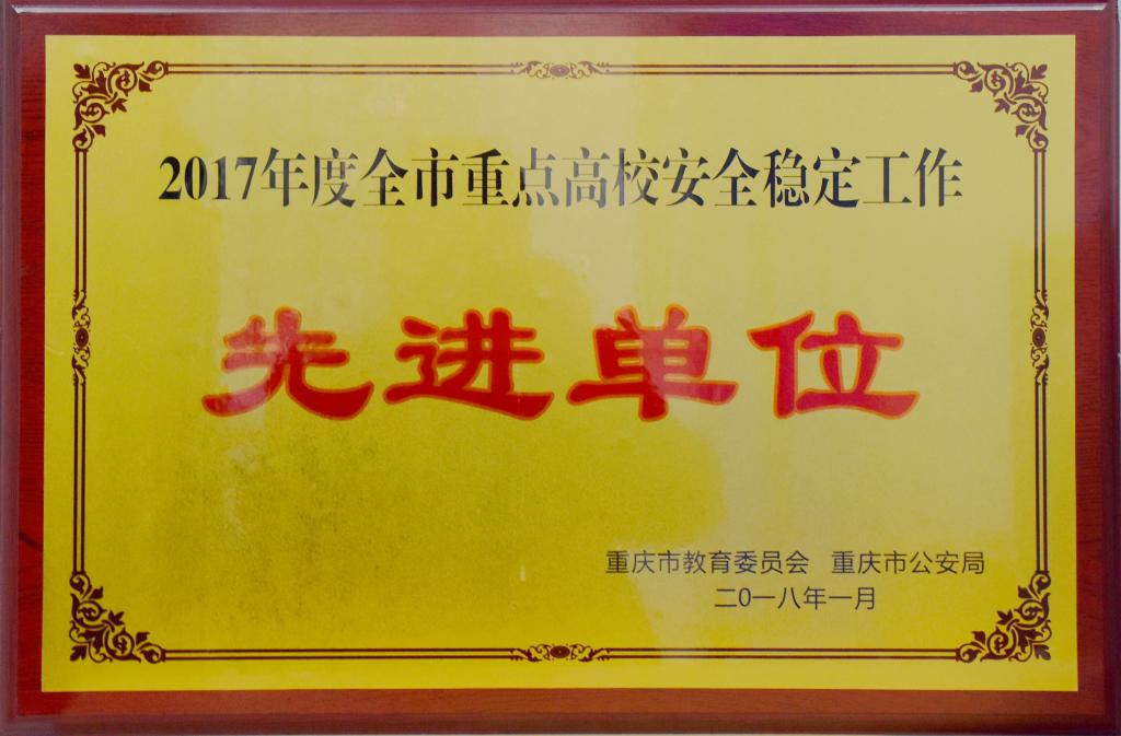 在2017年,我校紧密结合安保工作发展的新形势和新要求,求真务实,锐意进取,扎实推进平安高校建设工作,创造了稳定、平安、和谐的校园环境,全力保障了学校的教育教学科研等工作的有序开展,安全稳定工作取得了突出成绩。会上,重庆市公安局、重庆市教委、重庆市高等教育学会保卫专业委员会联合授予我校“2017年度高校安全稳定工作先进集体”荣誉称号,这是我校连续8年被评为全市高校安全稳定工作先进集体,保卫处李正廷、范杰、毛敏鉴、赵希等4名同志被评为先进个人。