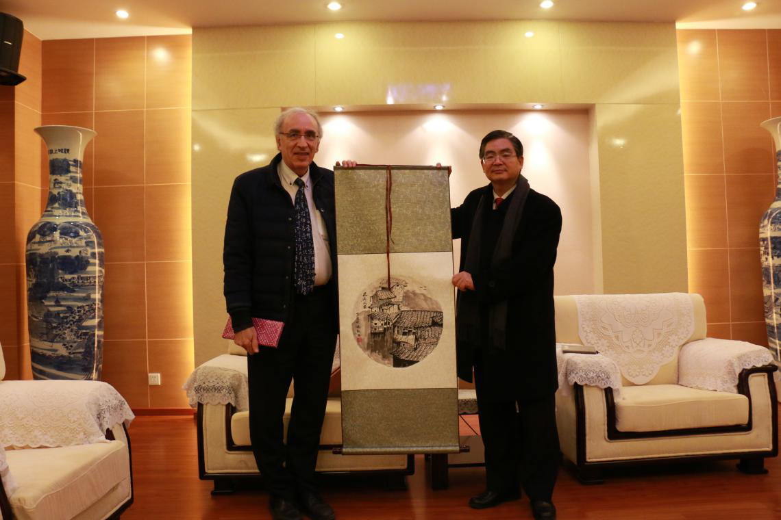 李克勇校长对来宾表示热烈欢迎,在宏文楼接待室与白乐桑教授进行了友好会谈并互相赠送礼物。