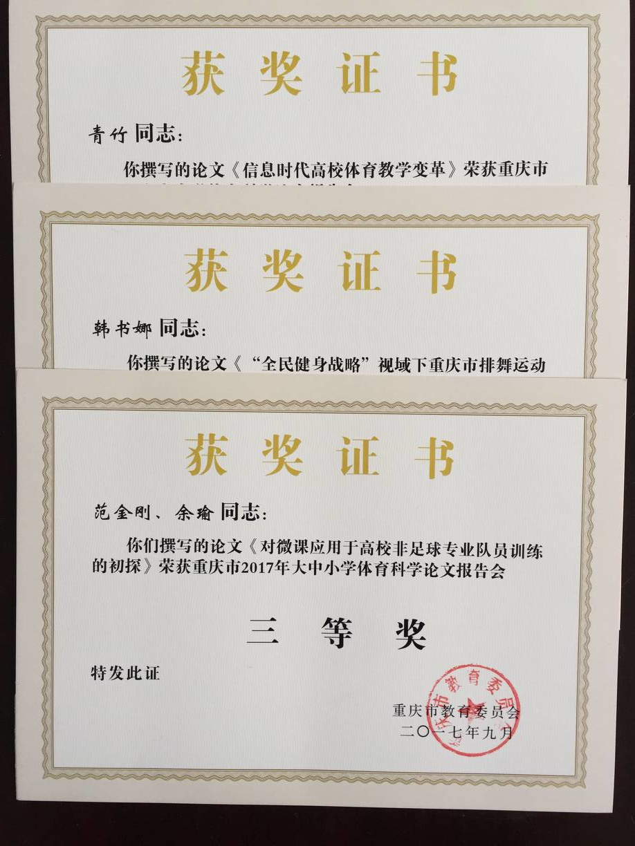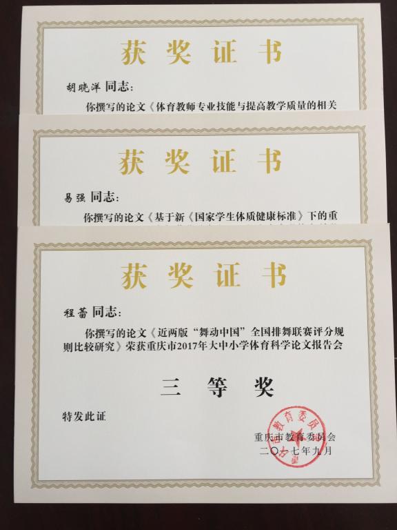 根据《教育部办公厅关于举办第十三届全国学生运动会科学论文报告会的通知》(教体艺厅函〔2017〕4号)要求,重庆市教委于9月组织开展了2017年大中小学体育科学论文报告会优秀论文评选工作。此次论文评选共收到35个区县(自治县)、40所高校和1个直属单位上交参评论文803篇。经专家评审,评出优秀论文540篇,其中基础教育345篇、高等教育195篇。